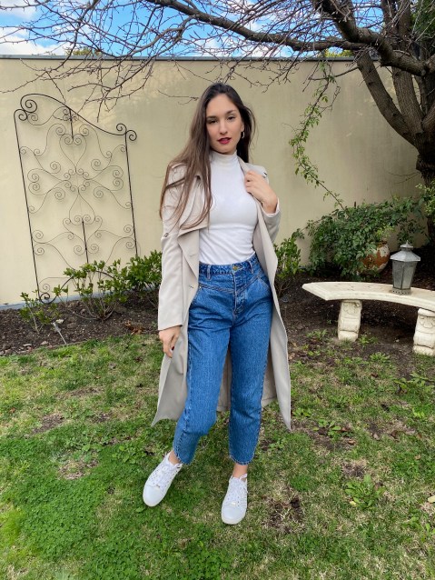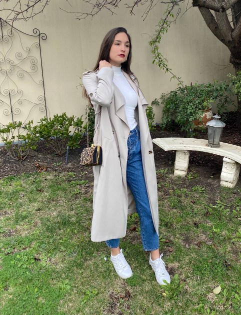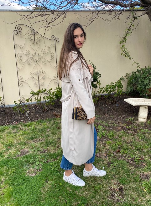 After the first lockdown concluded, it was pretty hectic juggling work and the final weeks of uni studies. But I did have the chance to buy a couple new pieces for work. Our customers have dubbed them as ‘mum jeans’ and I am obsessed with the cut of them. The skinny-leg style that has reigned for over 10 years has been pushed aside to make way for high-waisted, wide-legged jeans that are reminiscent of the 80’s. Today I wore them with a simple white turtleneck, decorated white sneakers, my classic trench and a vintage leopard-print bag. My outing to my backyard was short but sweet.