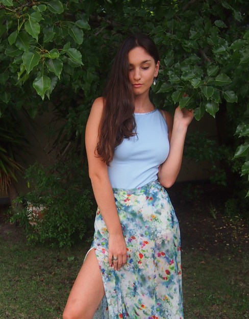 The other day I discovered a periwinkle blue top originally from Nicolangela, and a floral skirt originally from Topshop. I tend to shy away from these lighter colours because I don’t believe they suit my skin tone, but I actually love how much the top compliments the colours in the skirt. The transparency of the skirt gives it a slightly sexier look and the light-weight material will be perfect for the summer heat, which is often difficult to come by with maxi skirts.