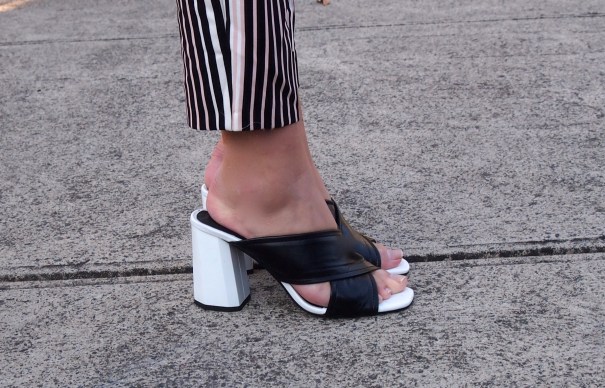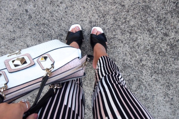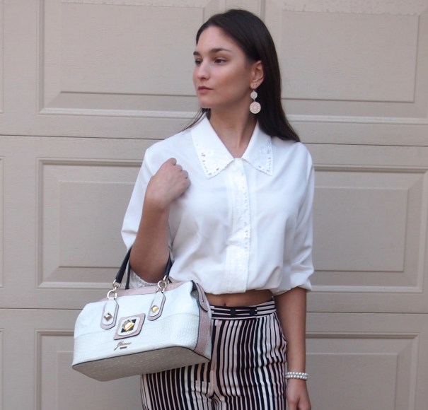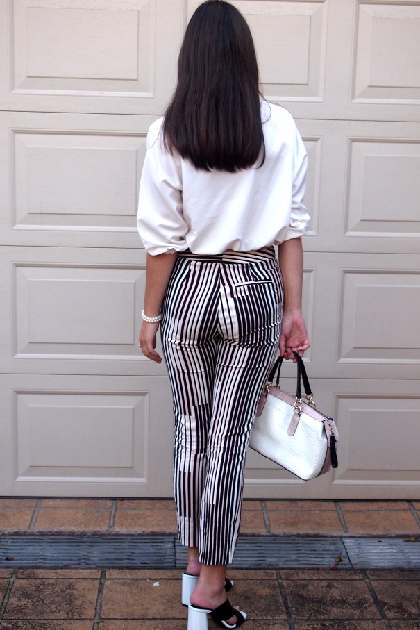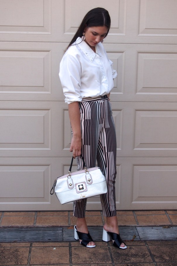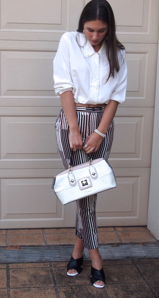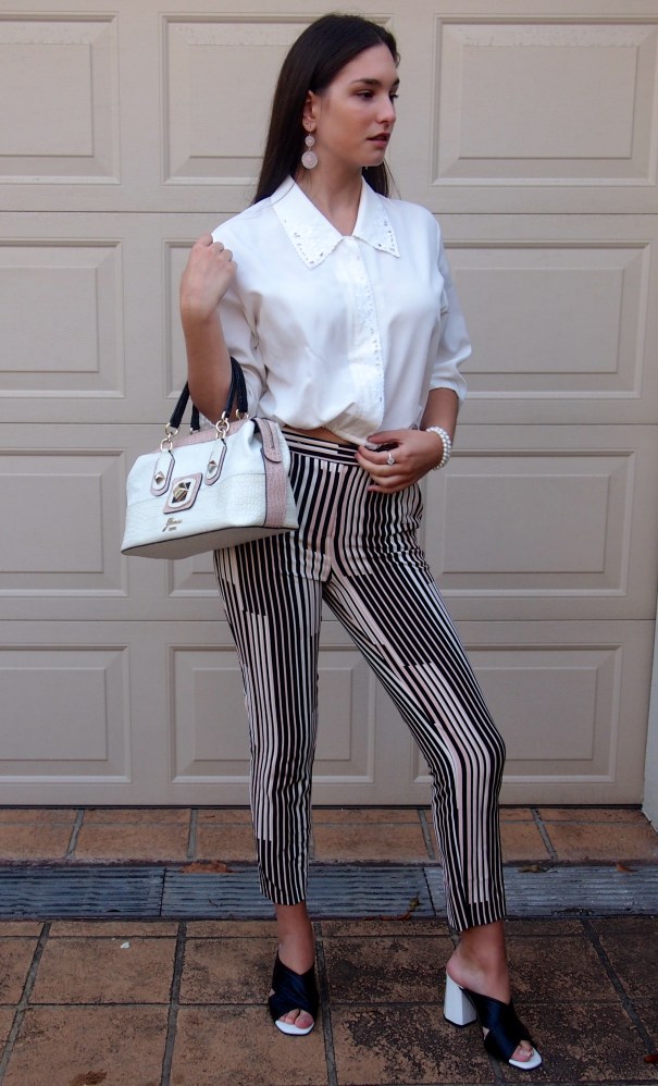 I wore a vintage white cropped shirt which I found at a market, striped high-waisted pants and black and white mules from Topshop. The outfit was perfectly swung together by a Guess bag that incorporated all the colours of the outfit and handy $5 drop earrings from Lovisa.