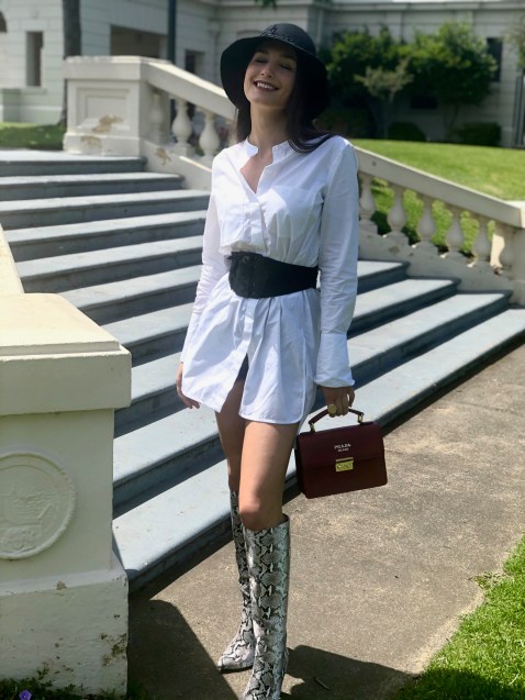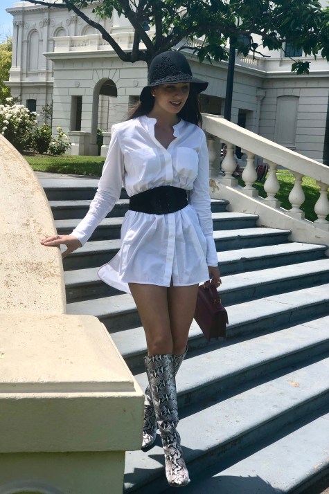 I slapped on my corset-style belt and transformed it into a shirt-dress (with little black shorts underneath – don’t want to experience any mishaps) with a matching black felt hat from Blue Illusion.