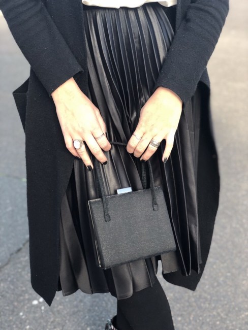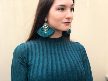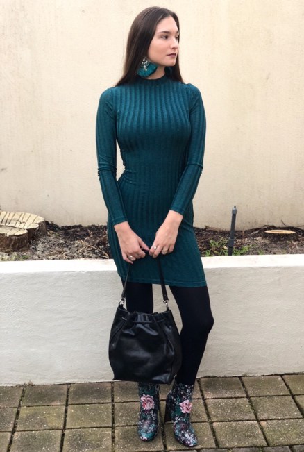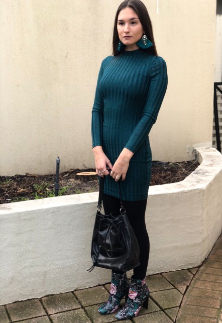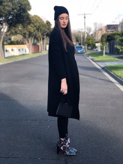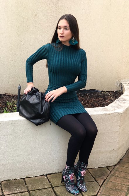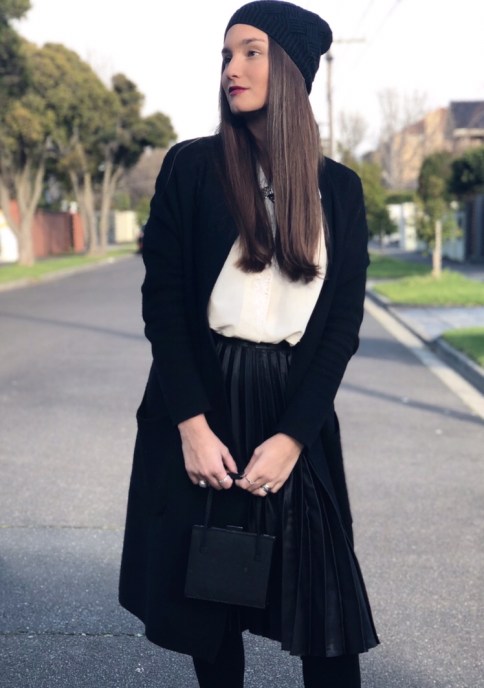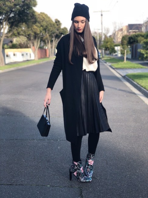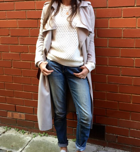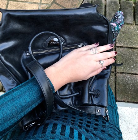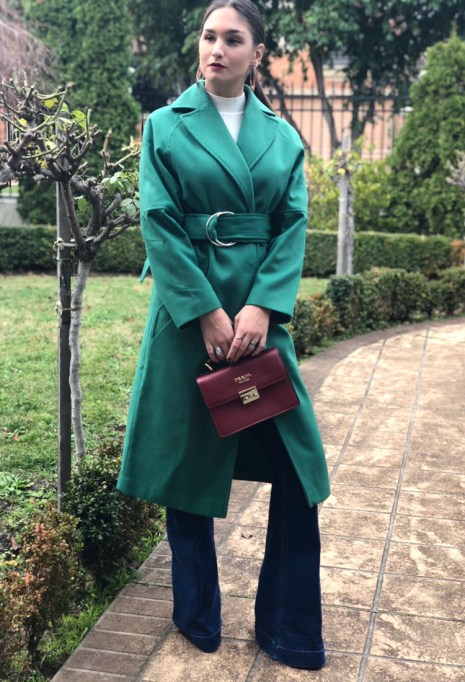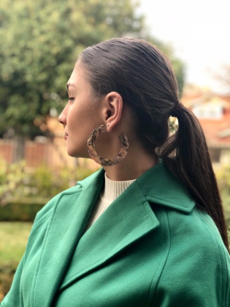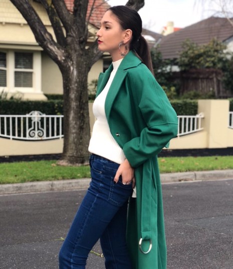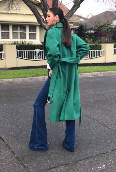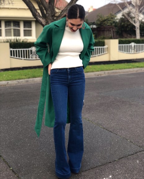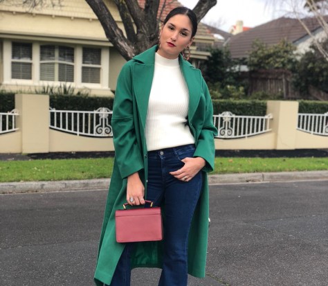 I thought that the creme turtleneck would act as a good neutral between the green, indigo and the burgundy of the bag, as well as to serve the 70s vibes radiating from those jeans. I tossed in the multicoloured Witchery hoops just in case the coat and jeans didn’t make enough of a statement, because why the heck not.