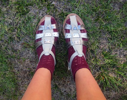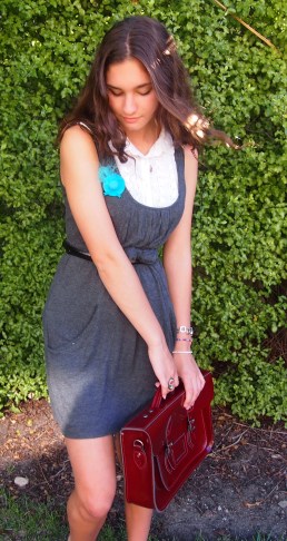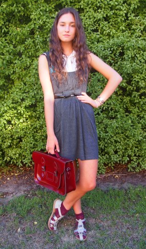 For yesterday’s outing I wore a dress which is traditionally a winter dress, but I wanted to mix things up a little. I coordinated it with a sleeveless collar top underneath to suit the warm weather with silver sandals and burgundy coloured socks that conveniently accompanied my satchel well. The end result was inadvertently school-girl-esque, supplemented by a finishing touch of a fabulous vintage brooch in the shape of a wide-brimmed hat. Now all I need is a blazer and I will be ready for school!