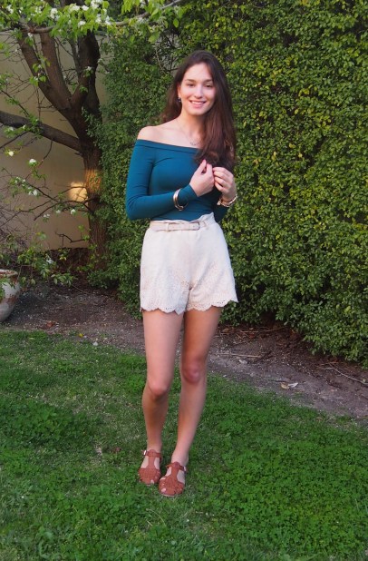Here is my own winter/spring attempt at the old off-the-shoulder with a long-sleeve top and high-waisted, suede shorts.