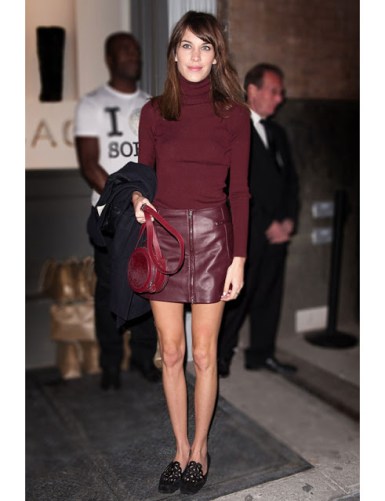 Although I often have my hesitations about leather skirts, they are never trashy when matched with a turtleneck (while maintaining the same colour scheme). The combination is sexy but never cheap, as confirmed by style queen Miss Alexa Chung wearing Versus: