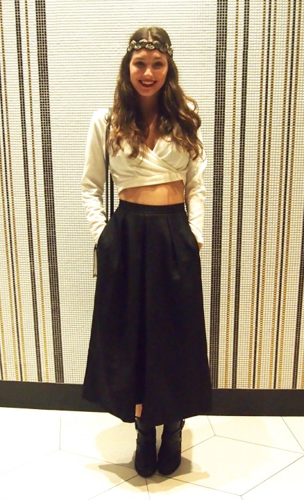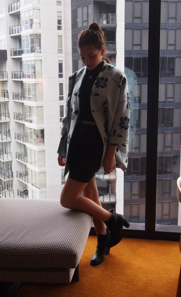 On my recent travels to the U.S, I found this lovely light blue/grey coat in Zara. It was so different (and on sale!) that I had to buy it, and although it’s not very warm, it is gorgeous to look at. Due to the black-stemmed-flower prints scattered on the coat, I wore it with a cropped, black turtleneck top and a black faux leather skirt. It resulted in a slight 60s/90s mod theme with a kimono-style coat!