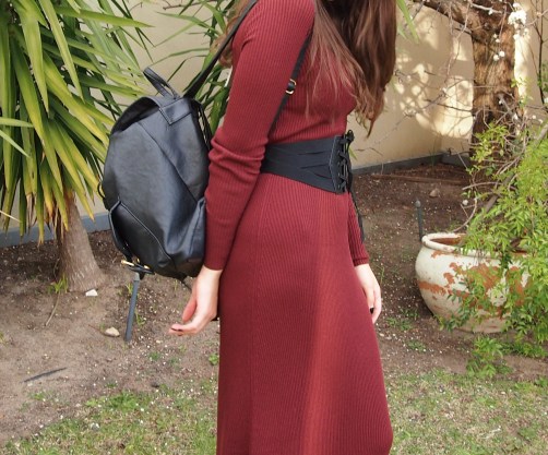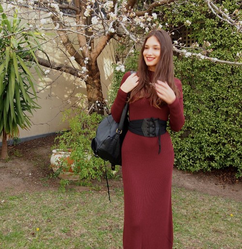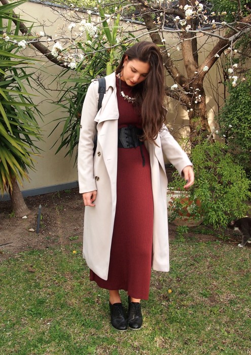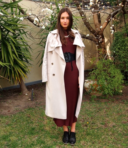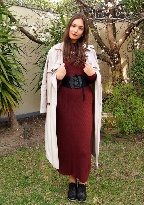 I love pairing this stone colour with burgundy, because makes the coat stand out and the dark shade allows me to incorporate some black accessories, when typically I would opt for brown or red accessories. Of course I’m wearing another Witchery knitted dress, because I tried wearing my jeans all day and bitterly regretted it. Wardrobe choices can be pretty darn limiting when a simple pair of jeans can’t be an option. It’s actually ridiculous how crucial jeans are, and you don’t realise until they’re nastily snatched out of your life. I can’t wait until I get these screws in my hip removed, because I am about to claw them out myself.