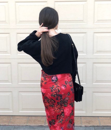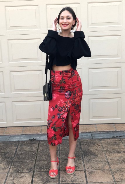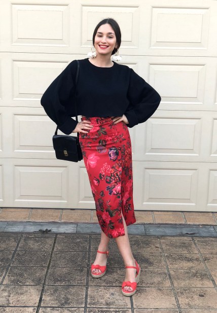 This jumper and skirt are both from Zara, and I love a cropped knit because it’s perfect to wear with my high-waisted bottoms. To further enhance the look, I put on some exciting earrings from Witchery and added more colour with orange wedges. The look is not complete without a touch of red lippy, of course.