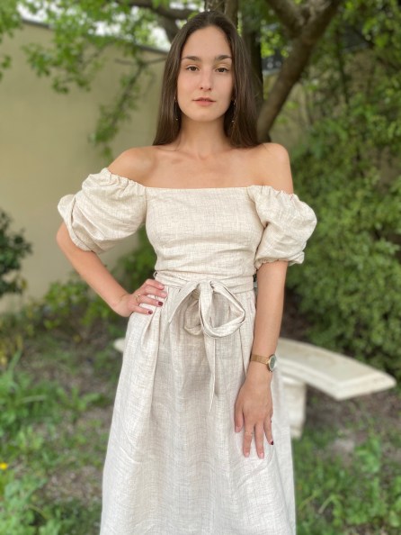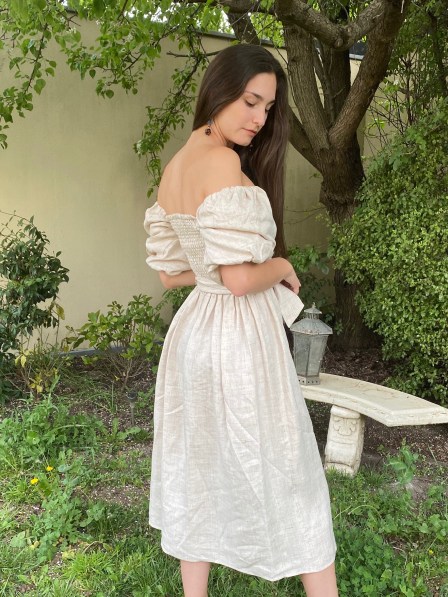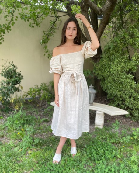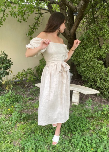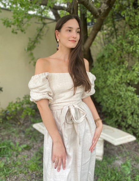 It’s made from 100% linen and the sleeves are actually intended to be worn on the shoulders, but I prefer a bit of off-the-shoulder action. It makes me feel like a young lass from the old-timey times who didn’t have a whole lot to do a part from dress pretty and sit around in nature dreaming about a future husband. Not too dissimilar to current day in Covid, except I sit around and think about watching another episode of Younger (are two seasons in one day too many?).